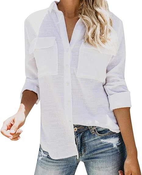 Amazon.com: Blusas sueltas para mujer a principios de otoño de algodón y lino con botones de camisa larga para vestir de manga enrollable, estilo informal, para trabajo : Ropa, Zapatos y Joyería